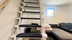 Dispozične dom s rozlohou 50 m2 pozostáva z veľkej obývačky, kuchyne a kúpeľne na prvom podlaží a zo spálne v podkroví.