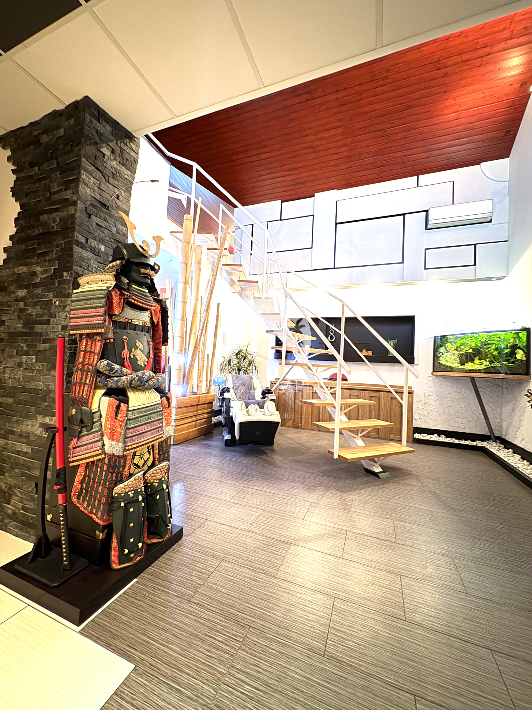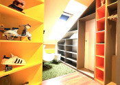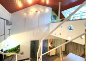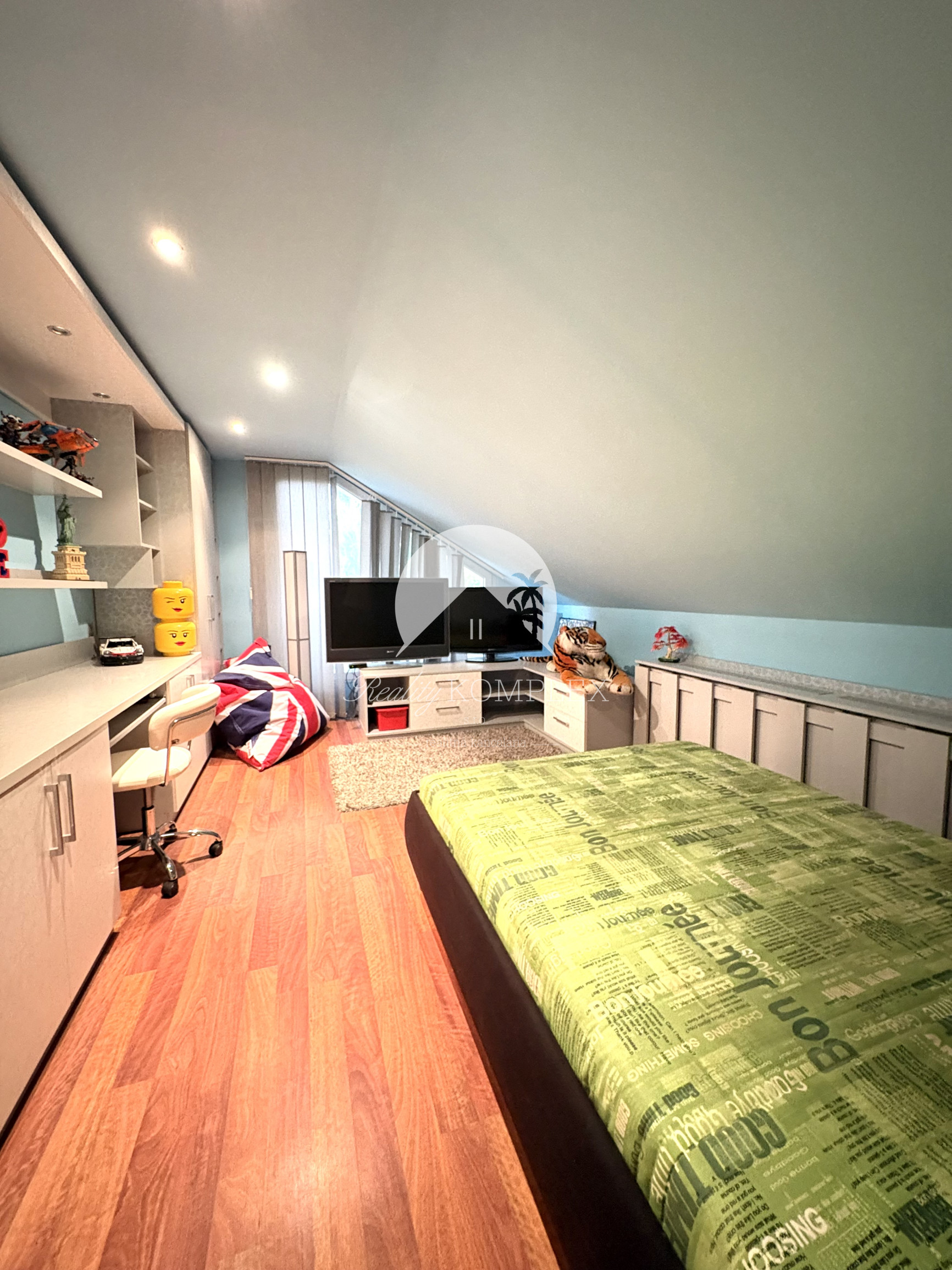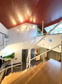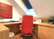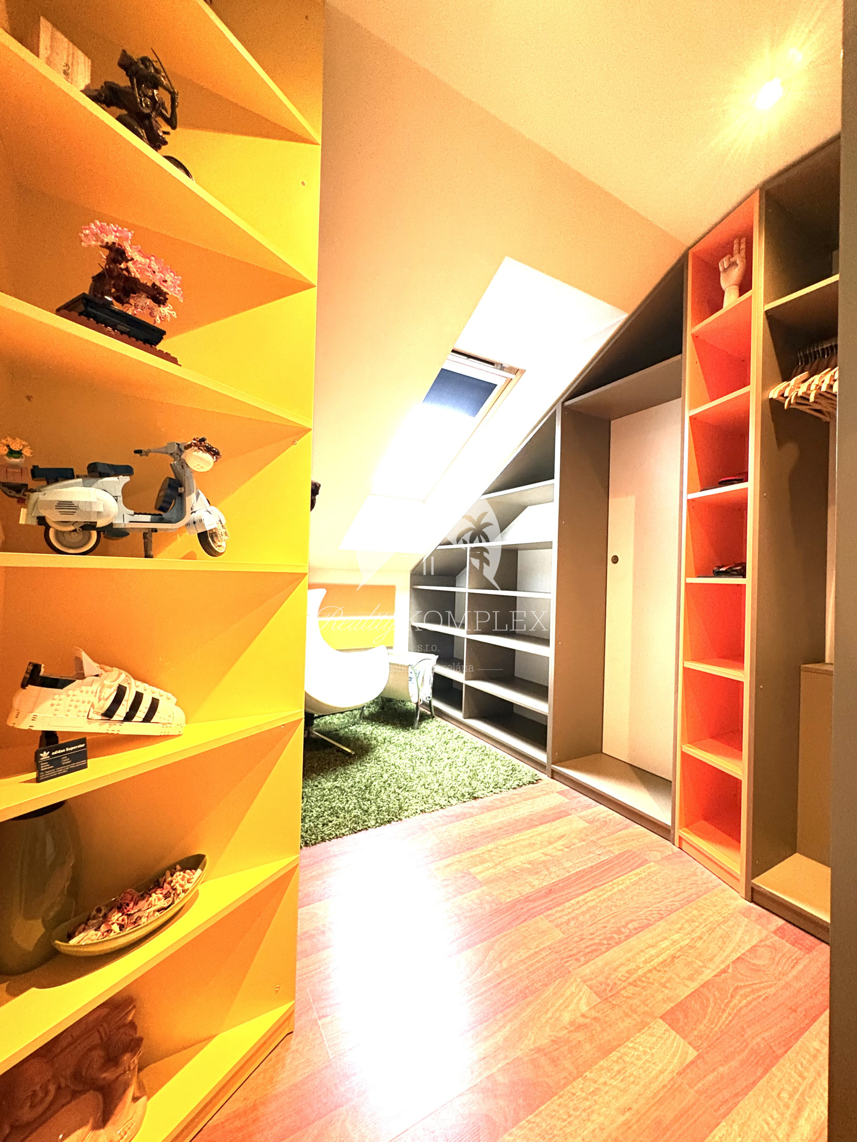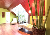 Podkrovie je riešené ako pokojná nočná časť: • galéria • veľká terasa • spálňa • pracovňa • šatník • kúpeľňa • dve samostatné izby