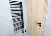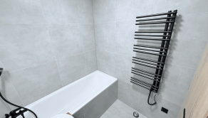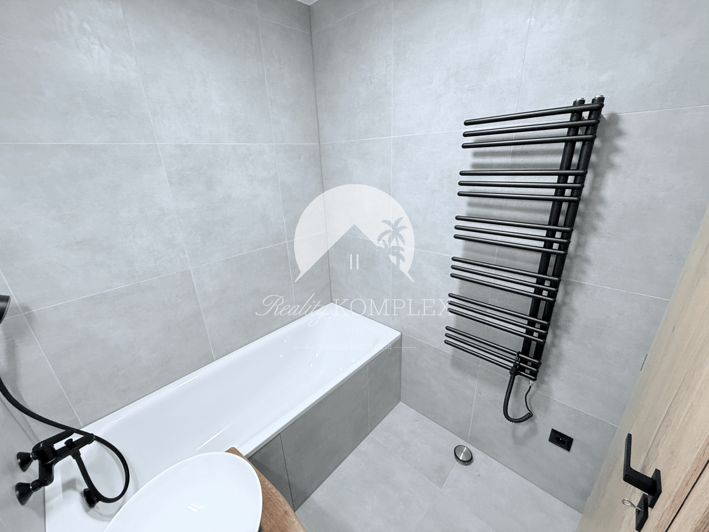 - sanita do kúpeľne a WC značky Grohe a Kaldewei, batérie značky Hansgrohe a radiátor v čiernej dizajnovej farbe