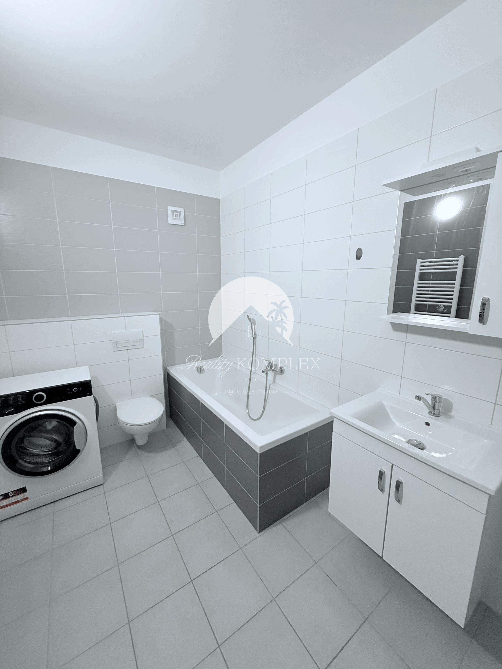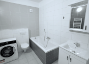 Kúpeľňa je vybavená vaňou, toaletou a práčkou.